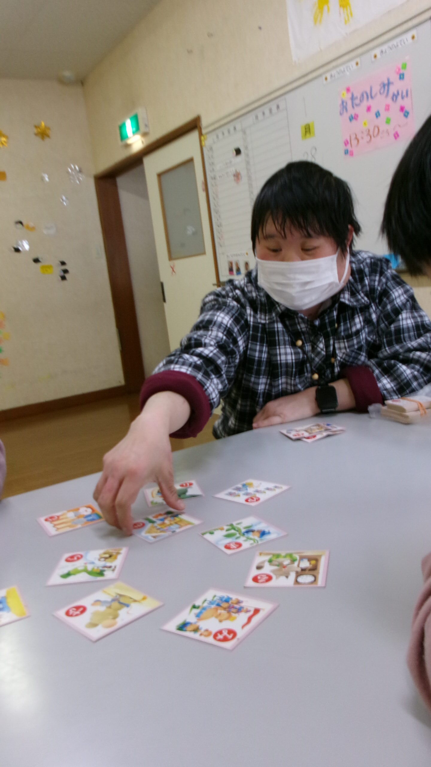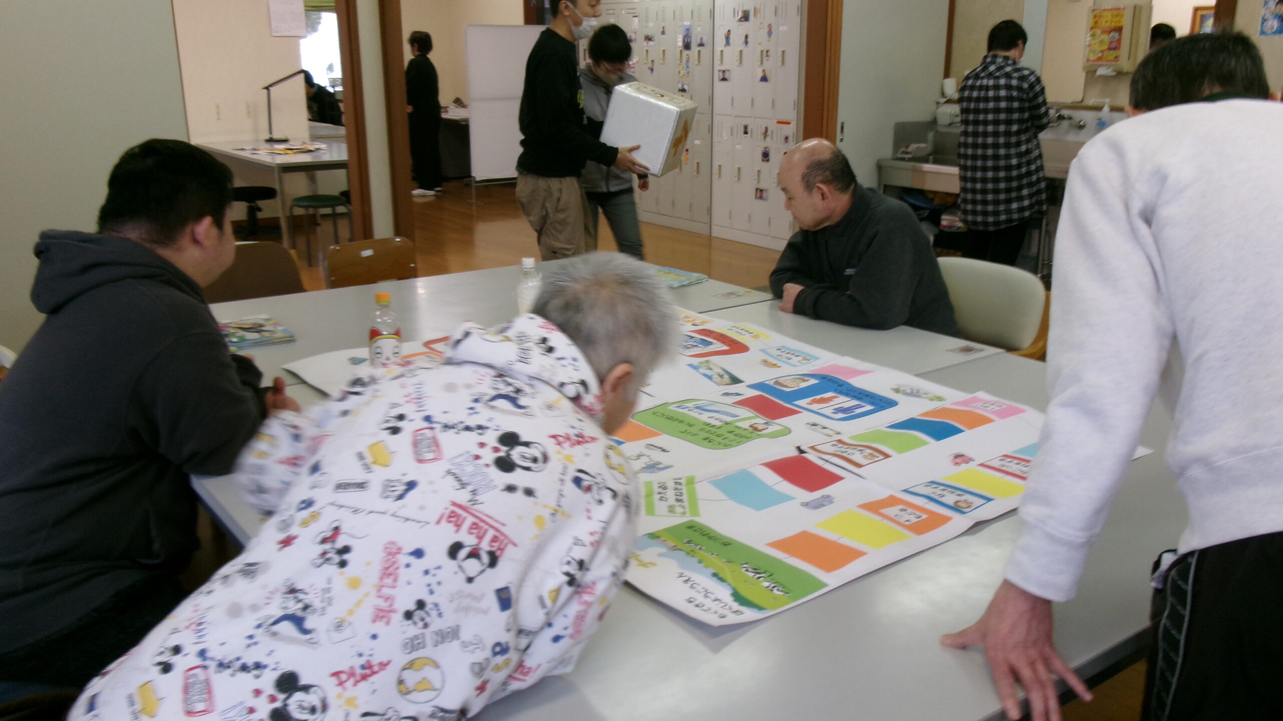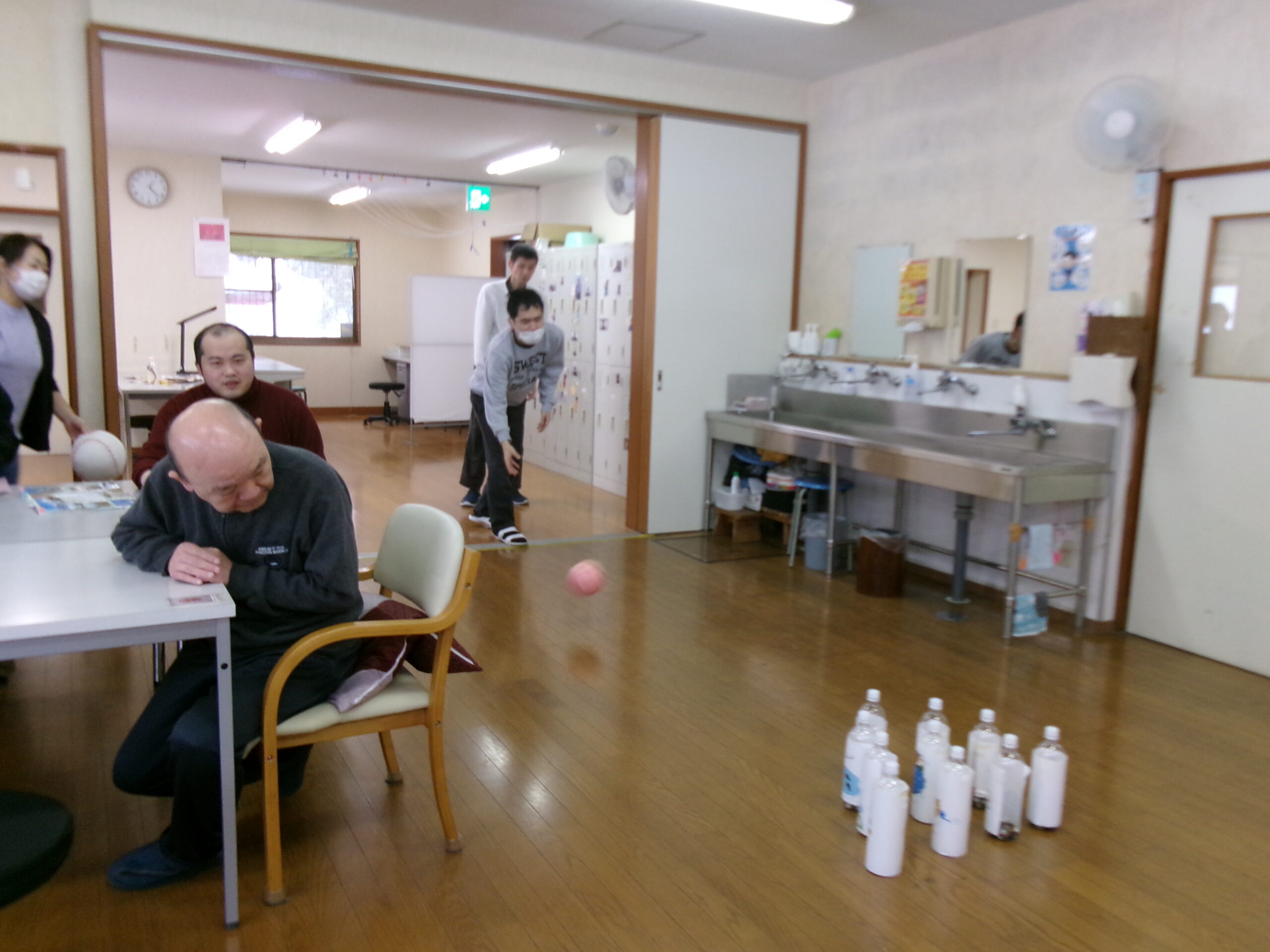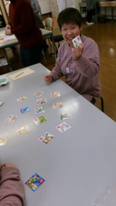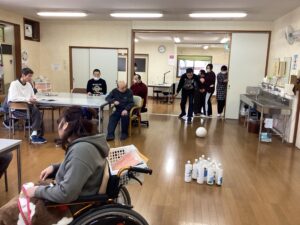 利用者さんと職員の手作りすごろくやボウリング、カルタで楽しんだあと、自治会で